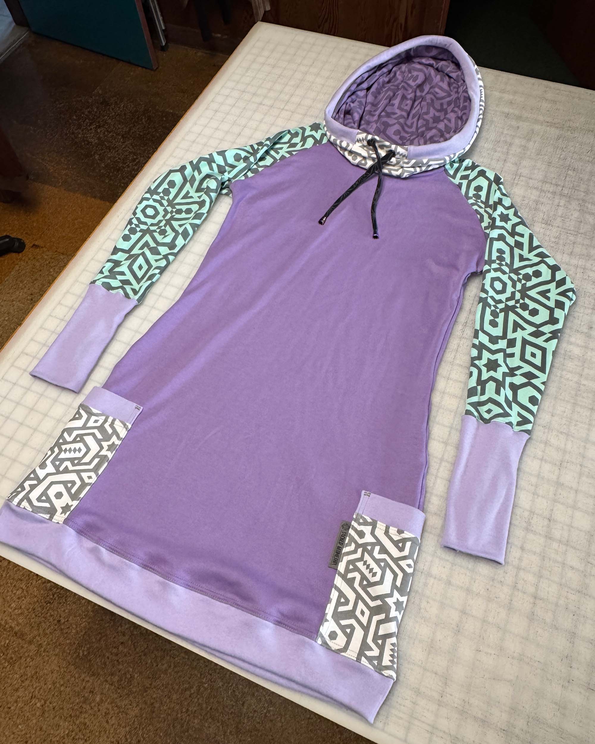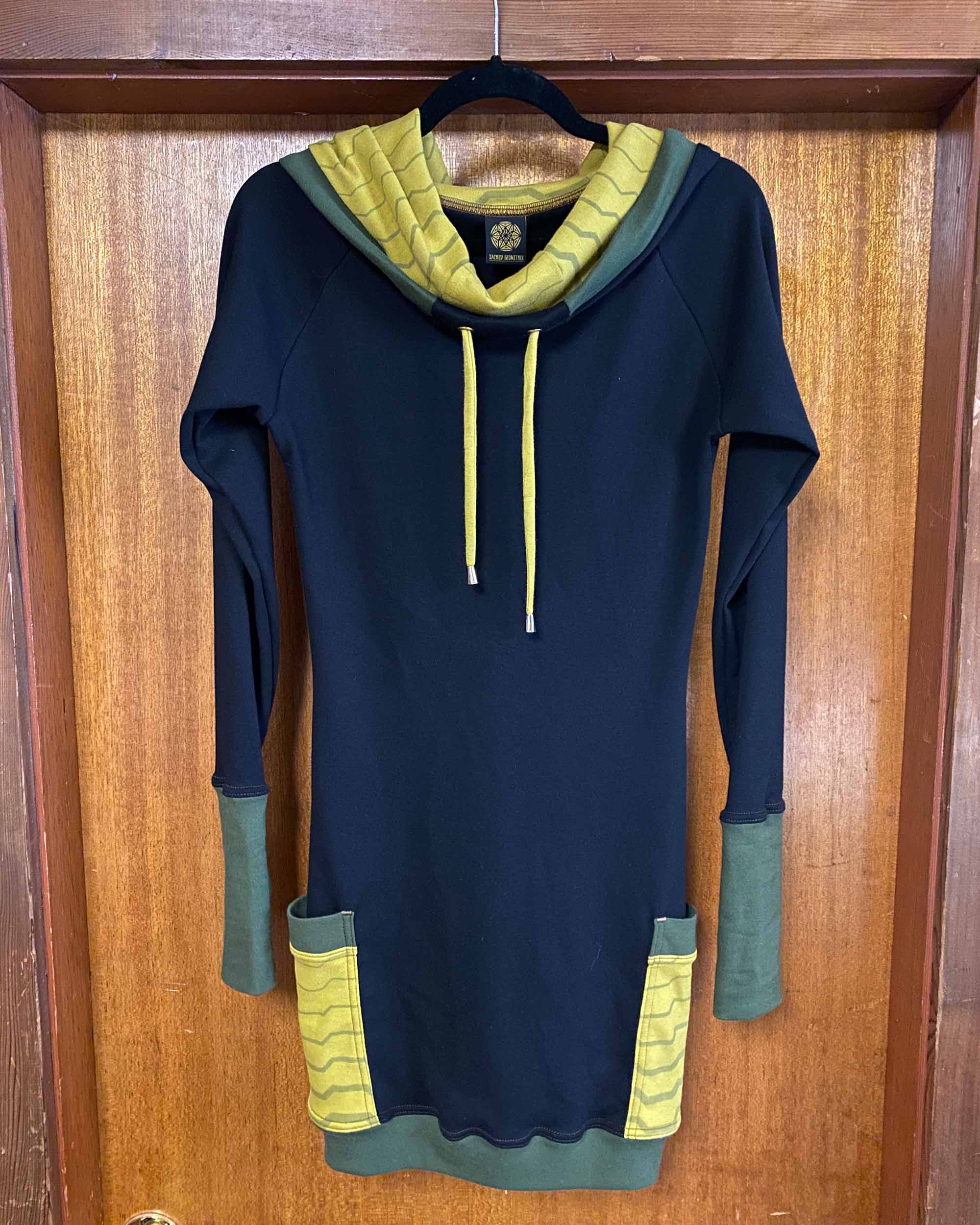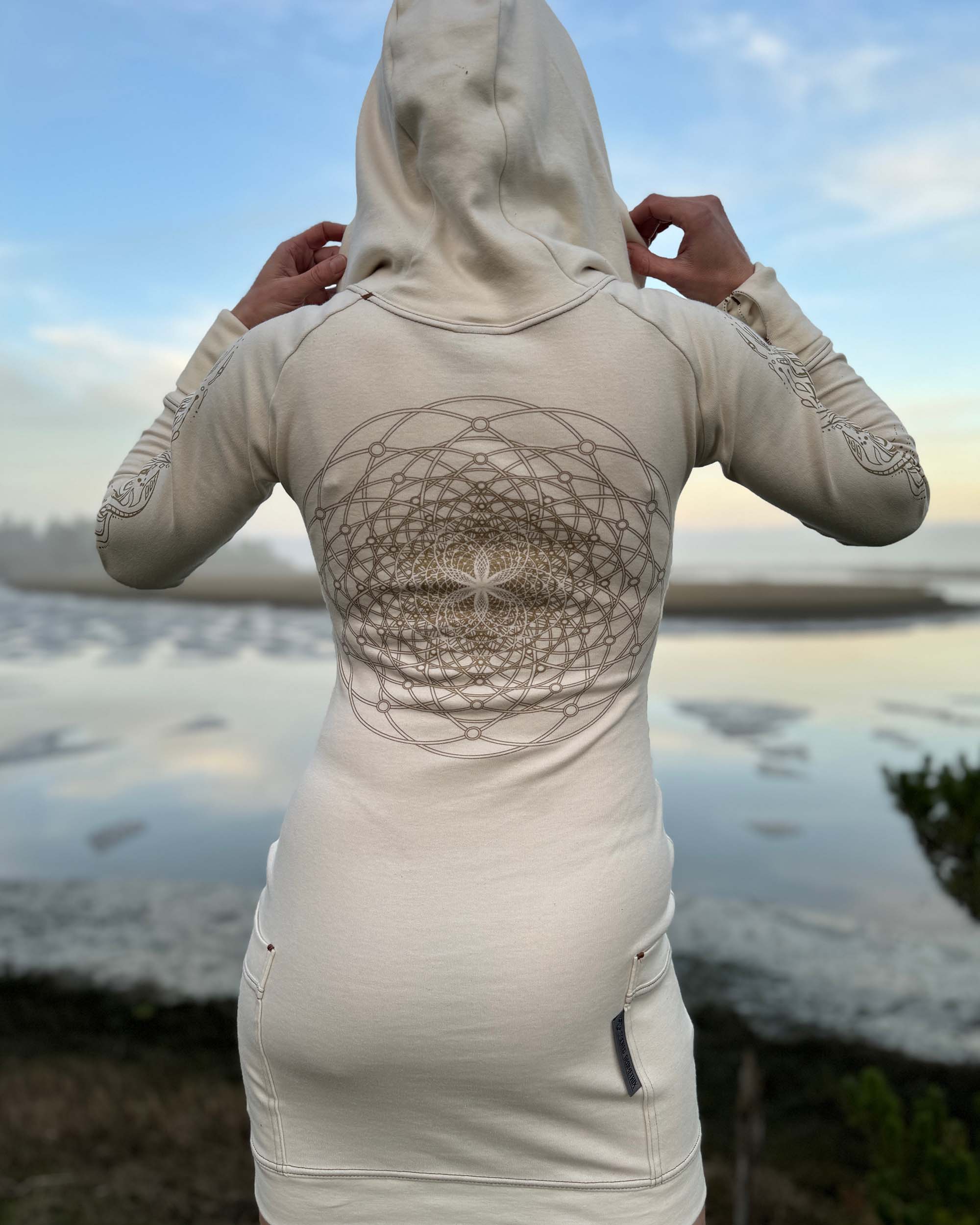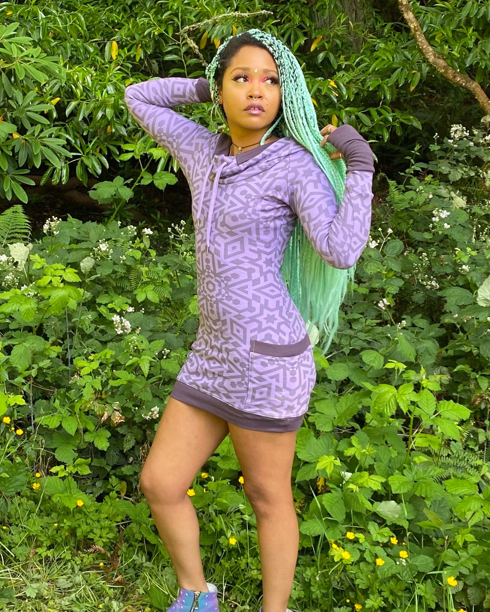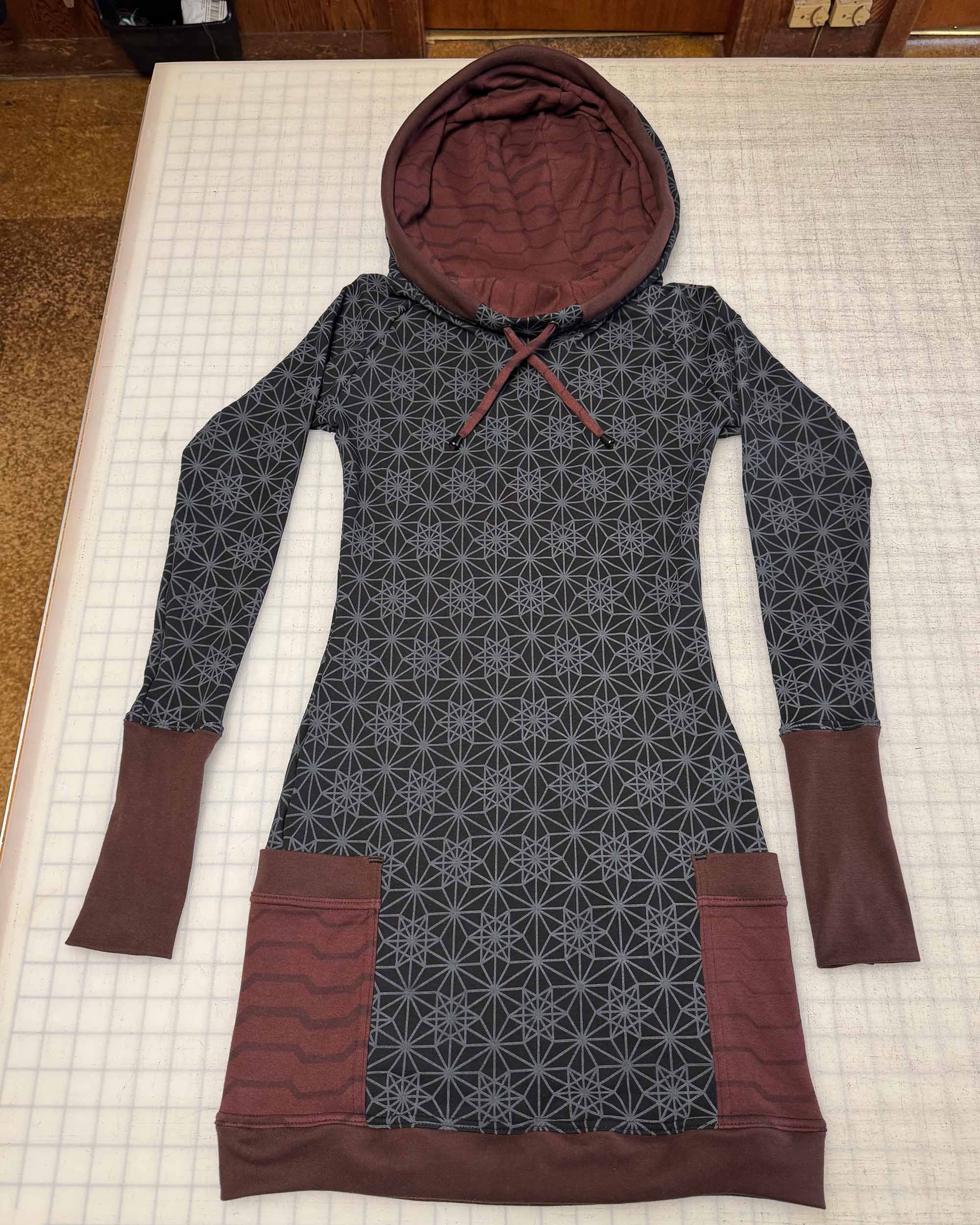 The Geo Modulator is your One of A Kind Garment Customizer. Edit and customize this fitted tunic dress with a cowl hood made in our 100% organic cotton interlock jersey knit fabric. Style with solids and geometric fabrics, screen prints, drawcords and extra add-ons. Build your dream Portal Dress today.