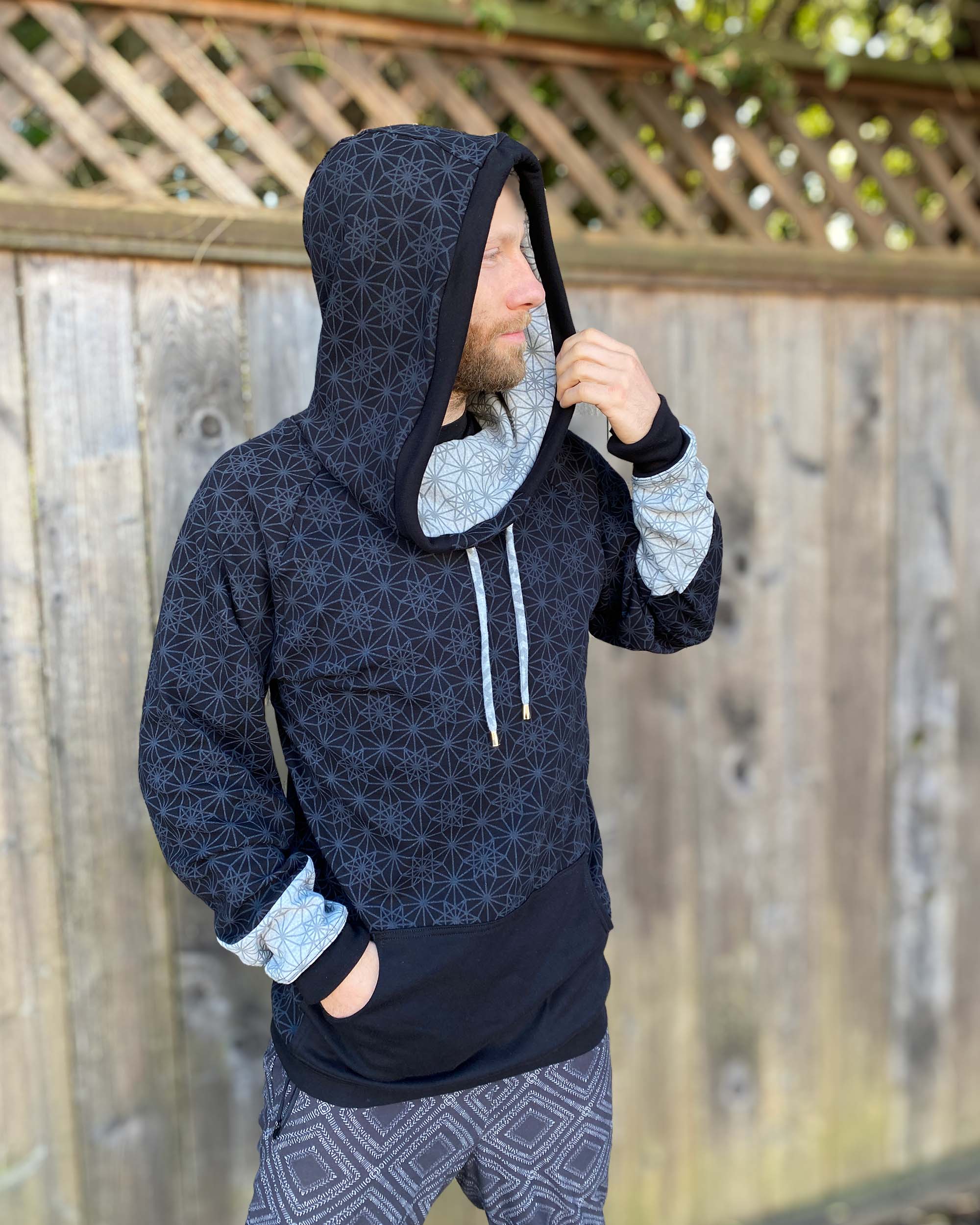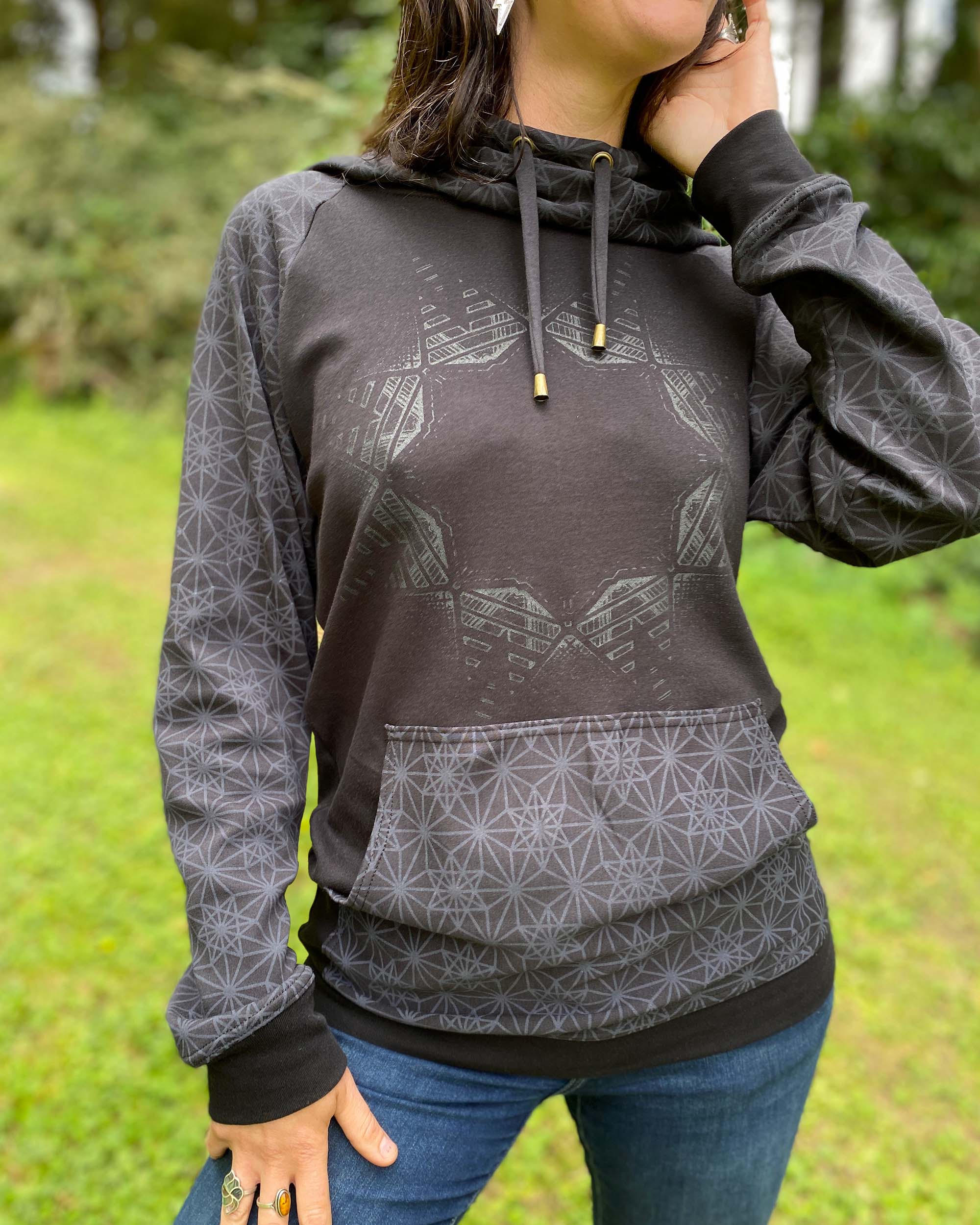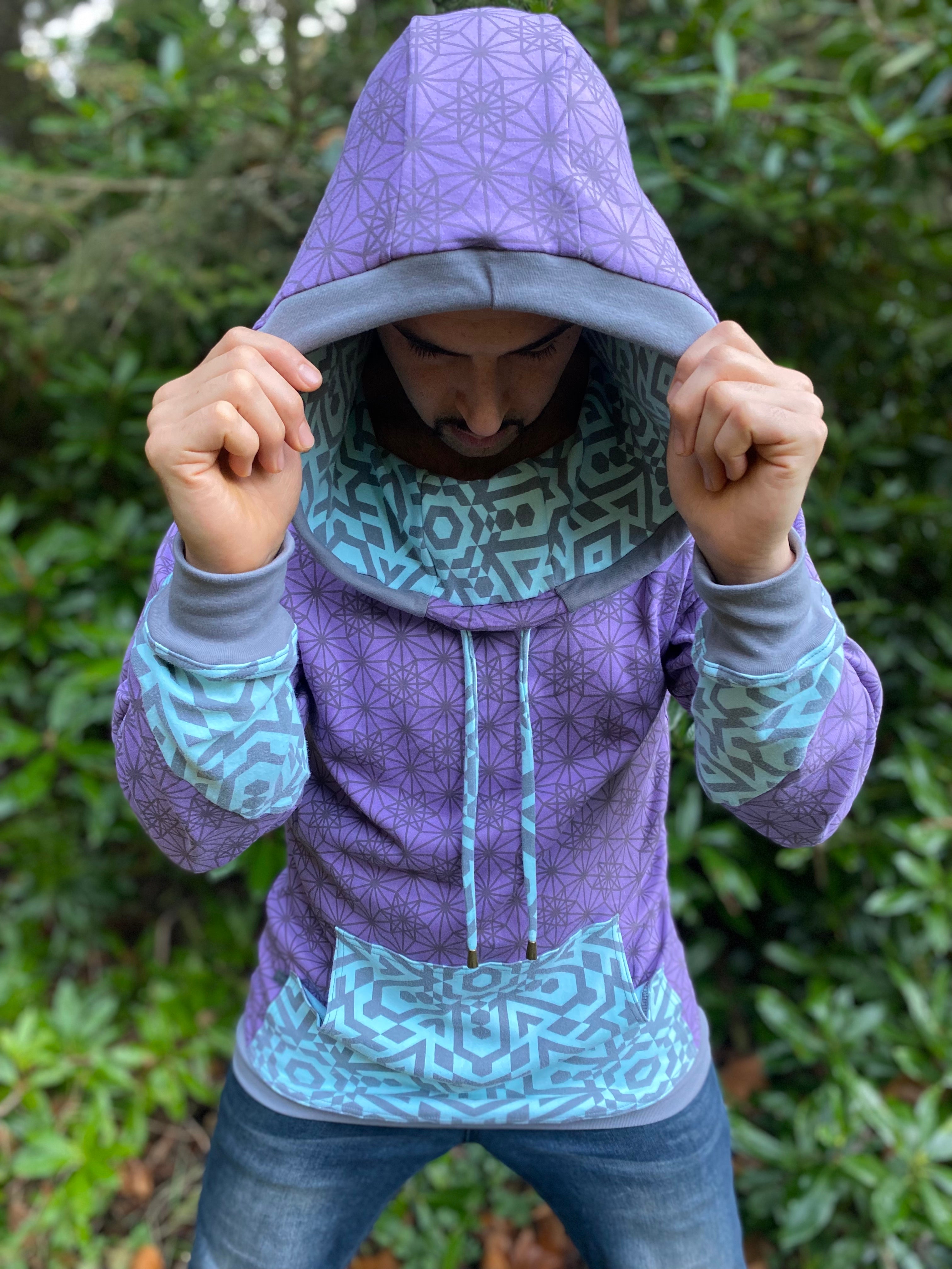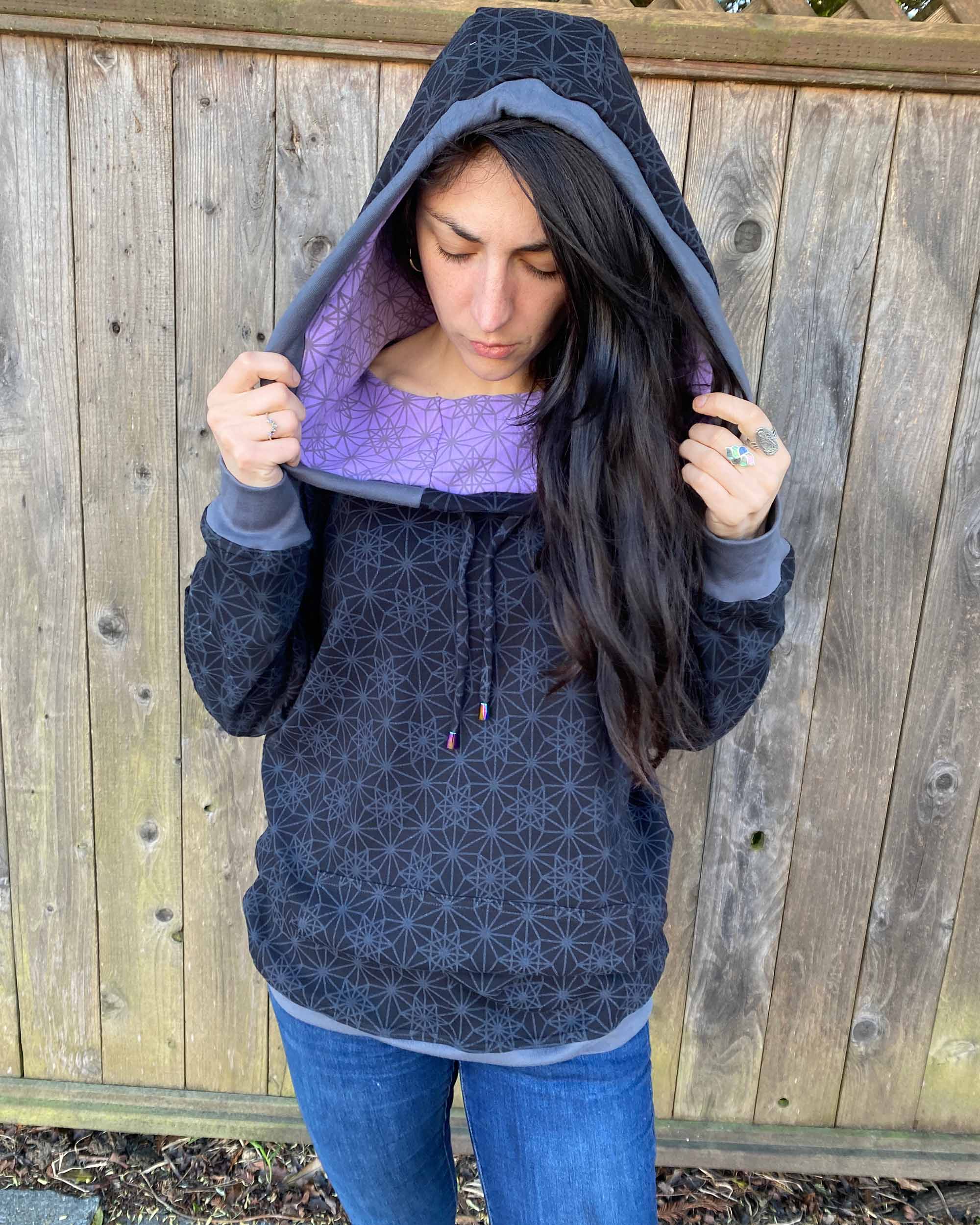 The Geo Modulator is your One of A Kind Garment Customizer. Edit and customize this long bodied cowl hood pullover made in our 100% organic cotton interlock jersey knit fabric. Style with solids and geometric fabrics, screen prints, drawcords and extra add-ons. Build your dream Portal Hoodie today.