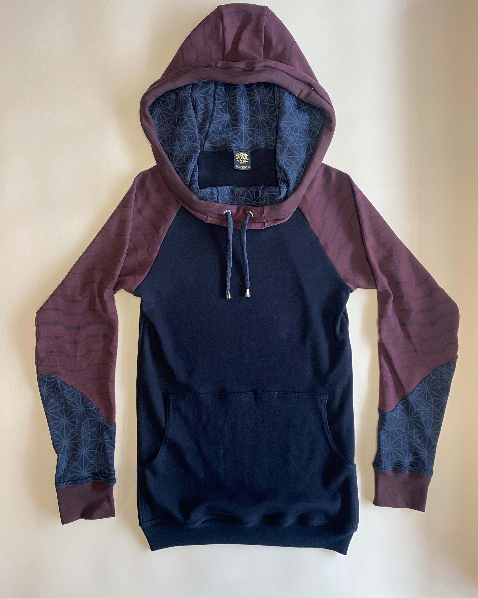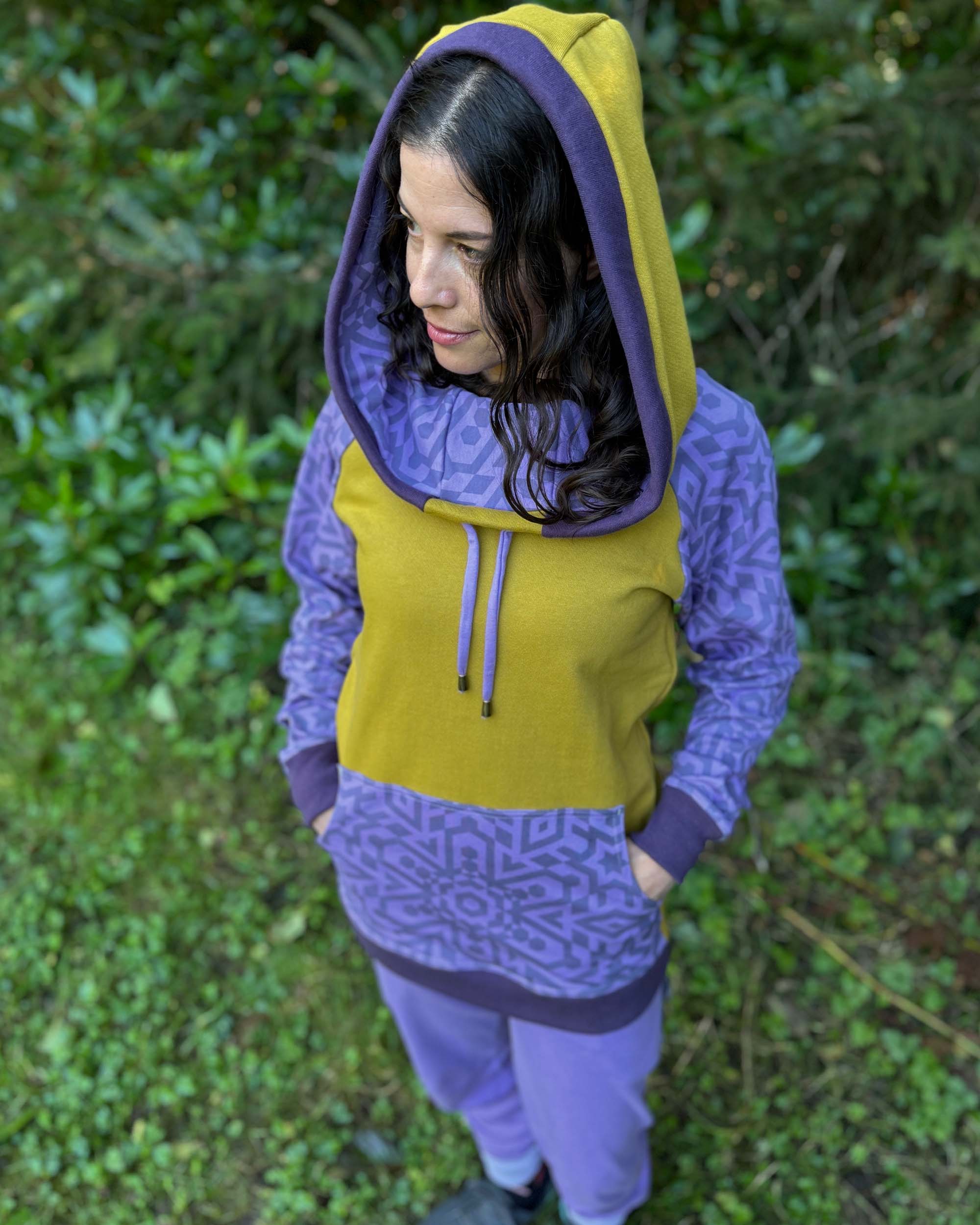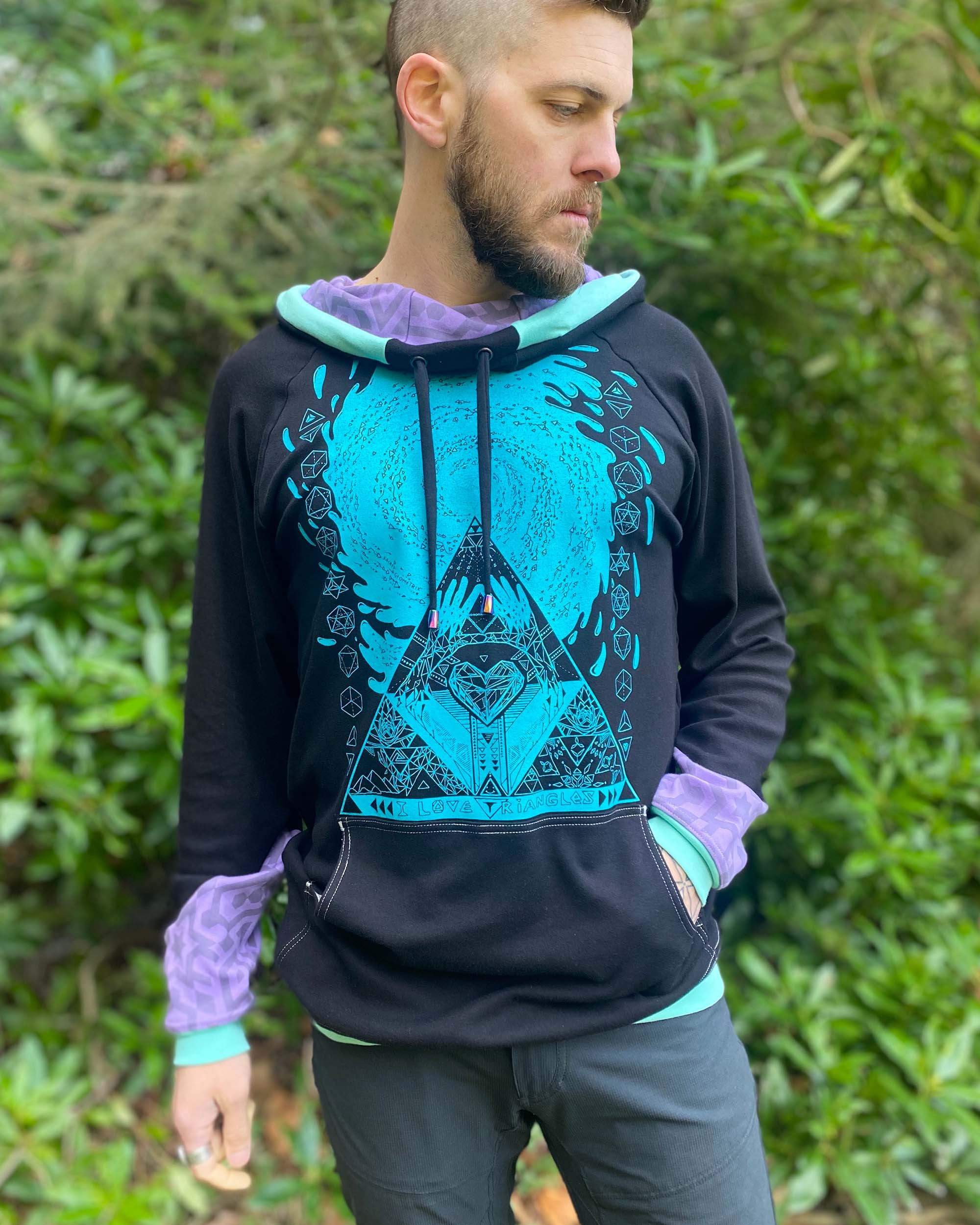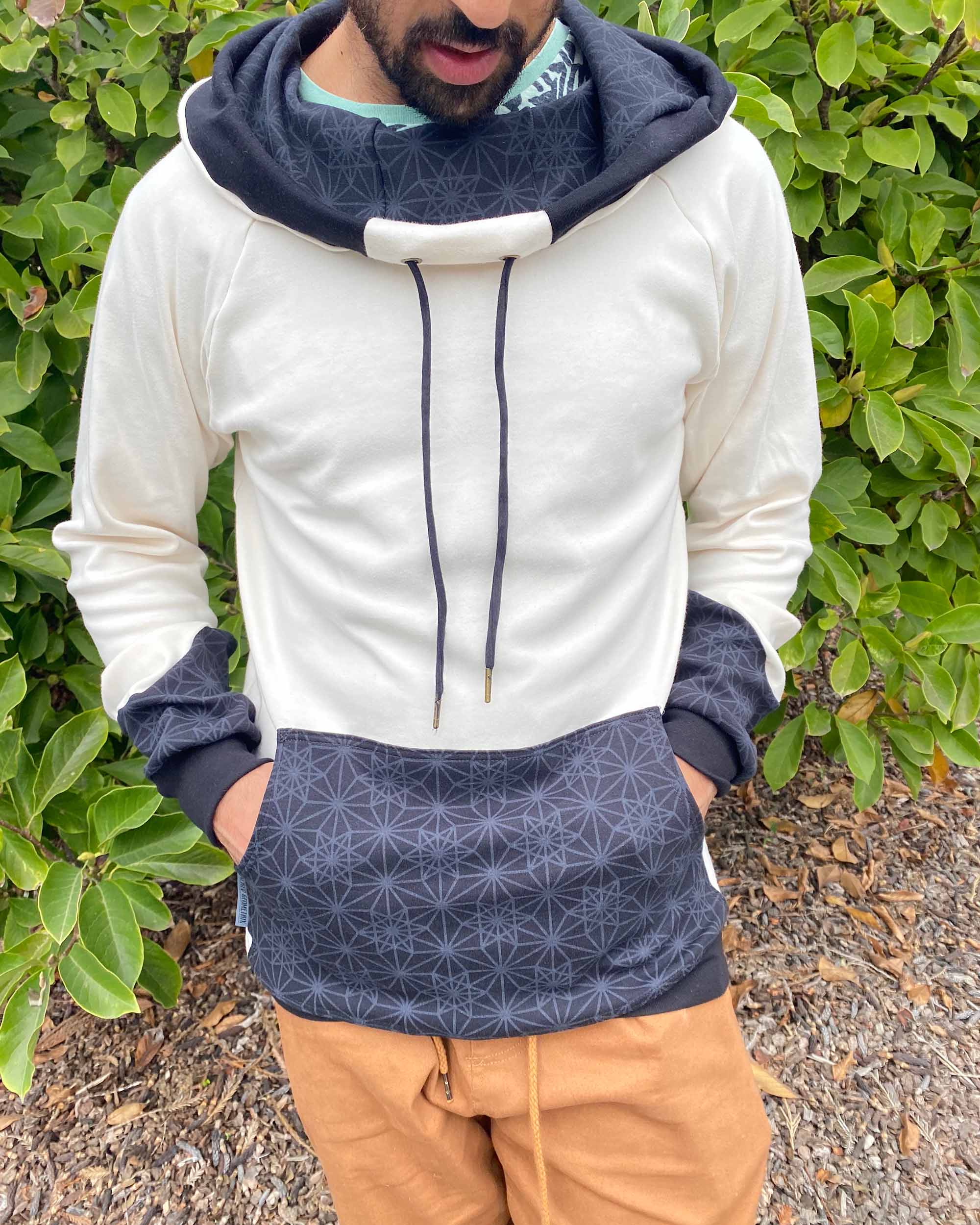 The Geo Modulator is your One of A Kind Garment Customizer. Edit and customize this long bodied cowl hood pullover made in our 100% organic cotton interlock jersey knit fabric. Style with solids and geometric fabrics, screen prints, drawcords and extra add-ons. Build your dream Portal Hoodie today.