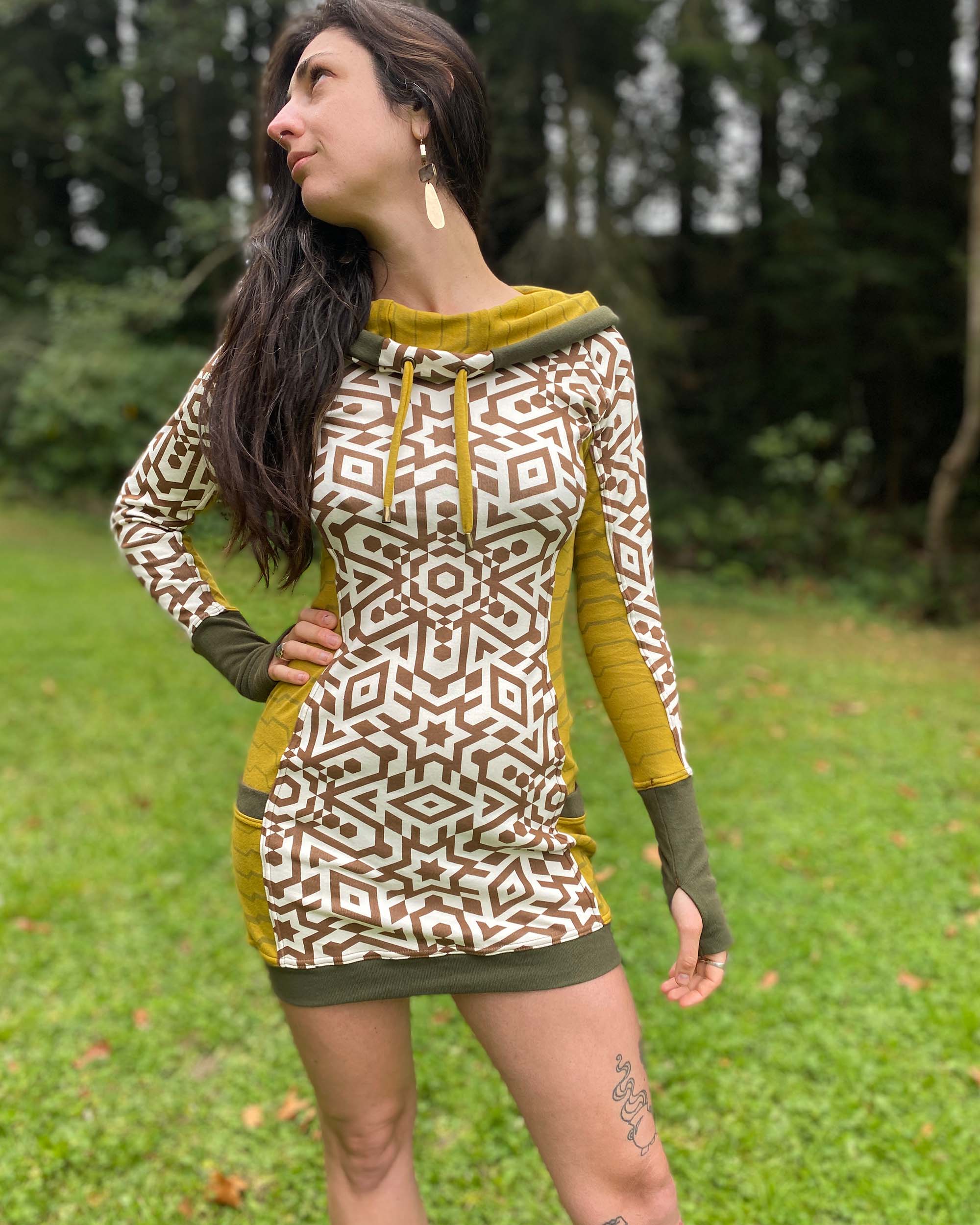 The Side Panel Portal Dress is a fitted tunic mini dress with a lined cowl hood and two side pockets.  Sleeves are finished with thumbhole cuffs in soft baby rib fabric.
