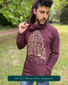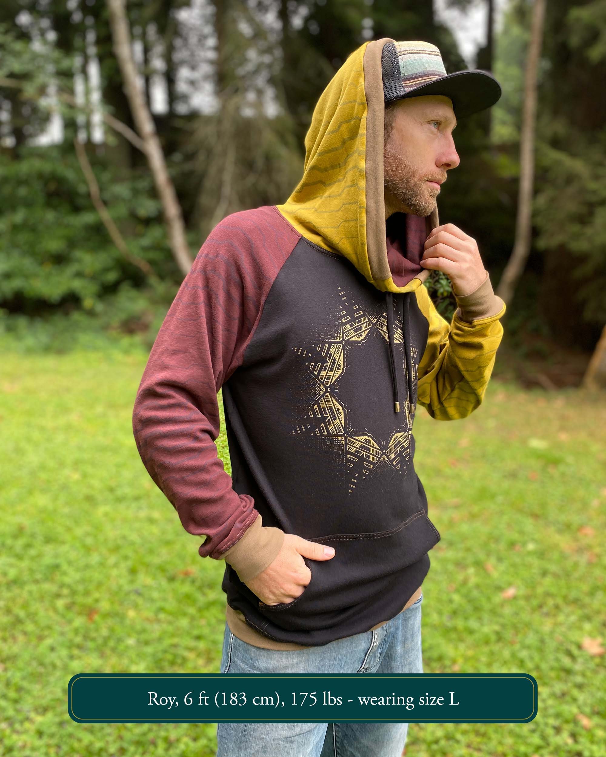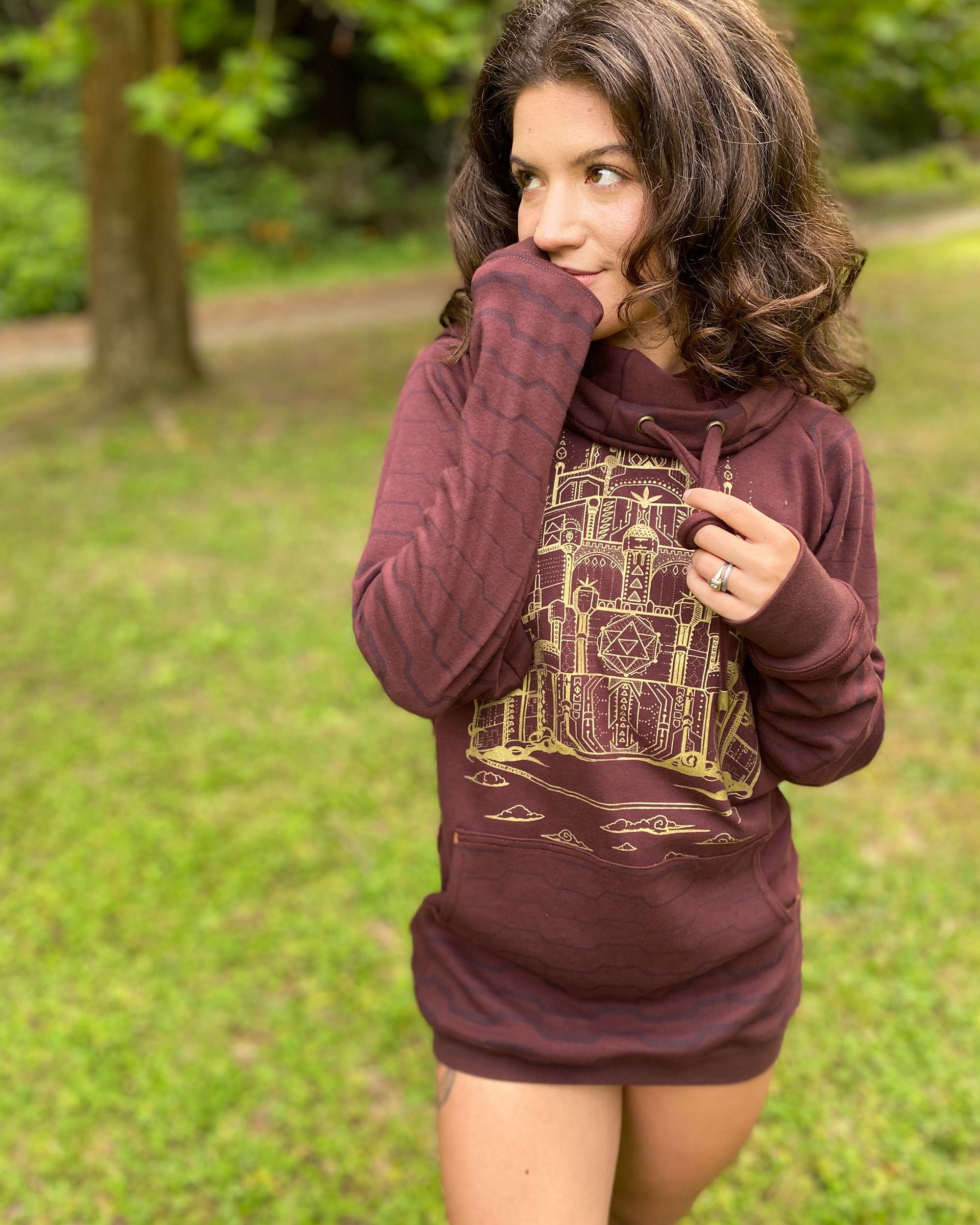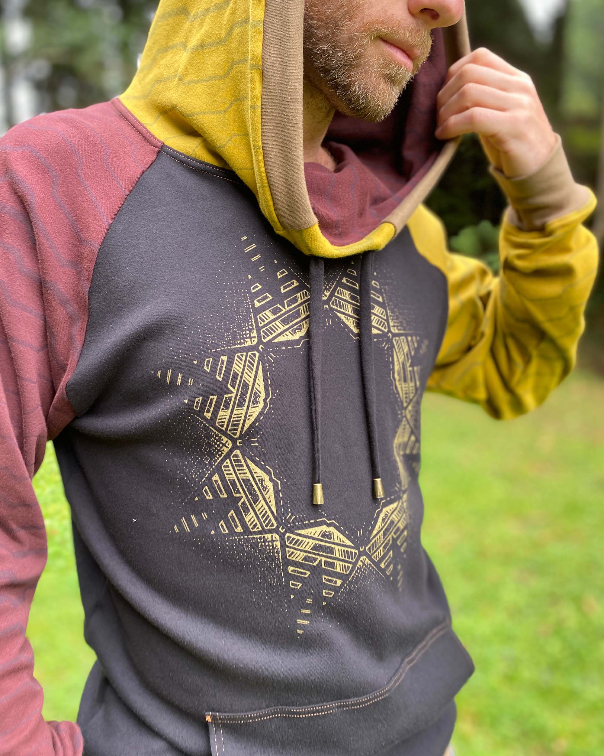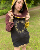 Made in 100% Organic Cotton, The Portal Hoodie is an extra long unisex pullover. A cowl hood fitted with drawcords and lined with soft interlock fabric and screen printed sacred geometry fabric make this the ultimate festival hoodie.