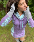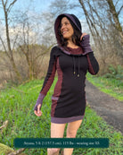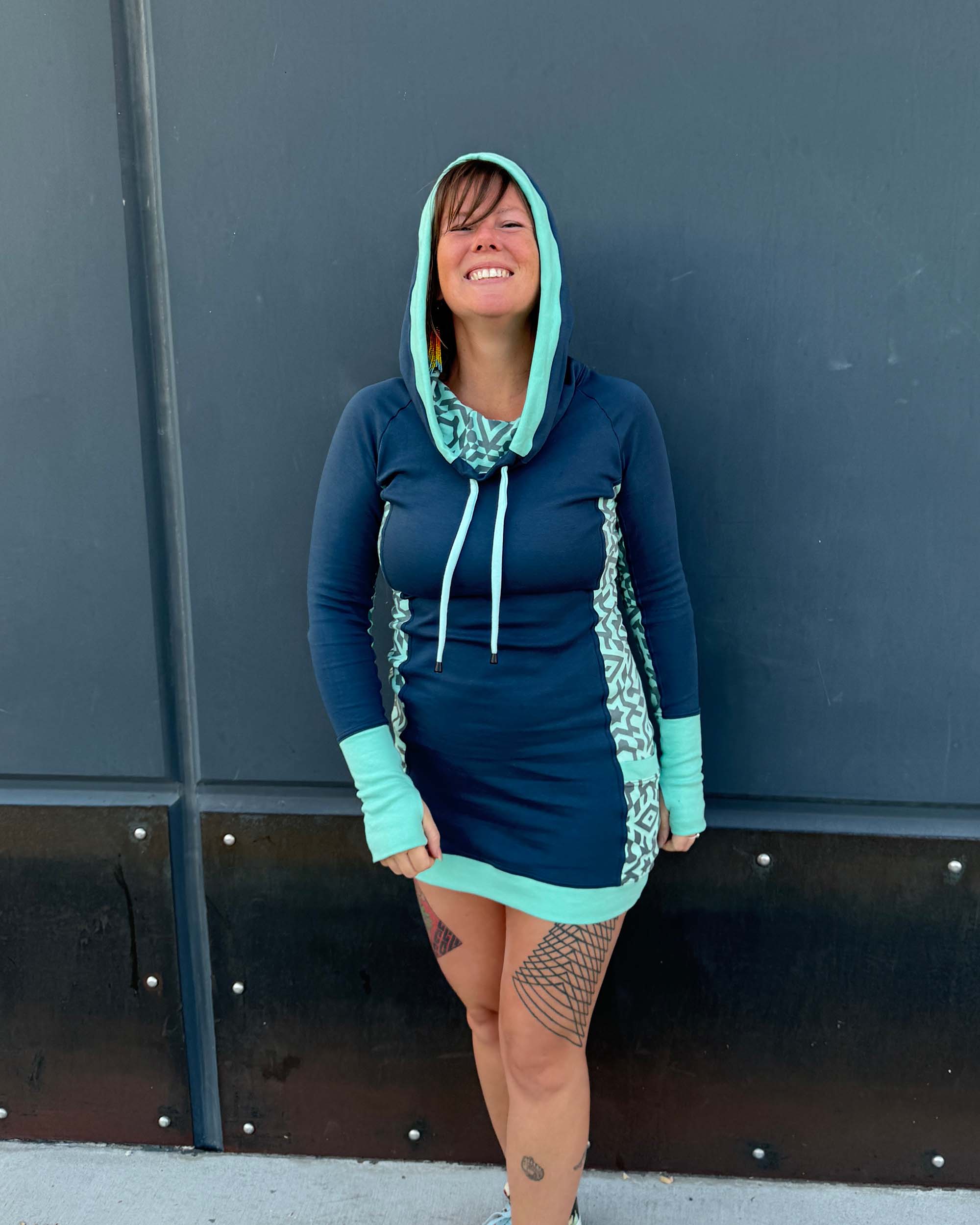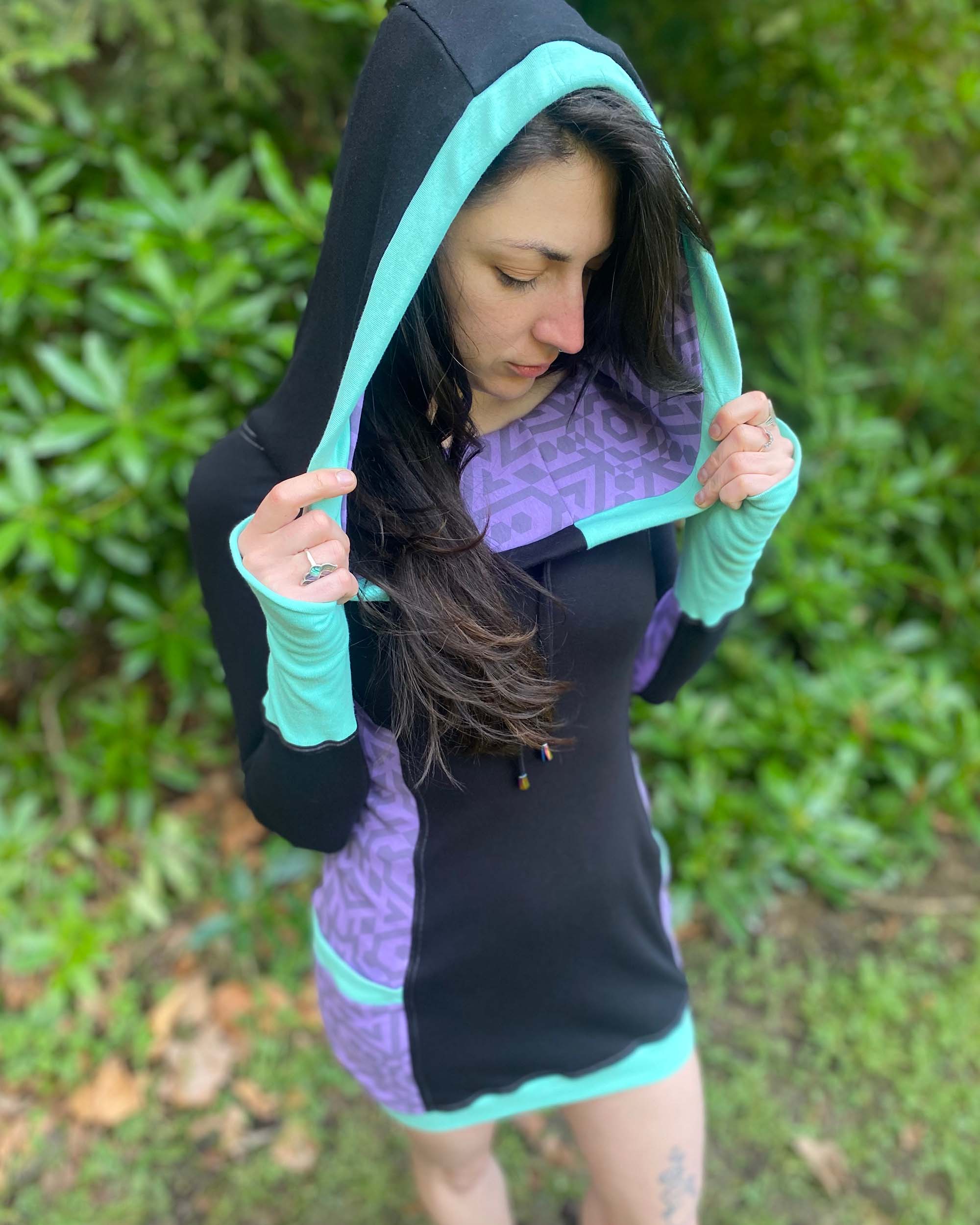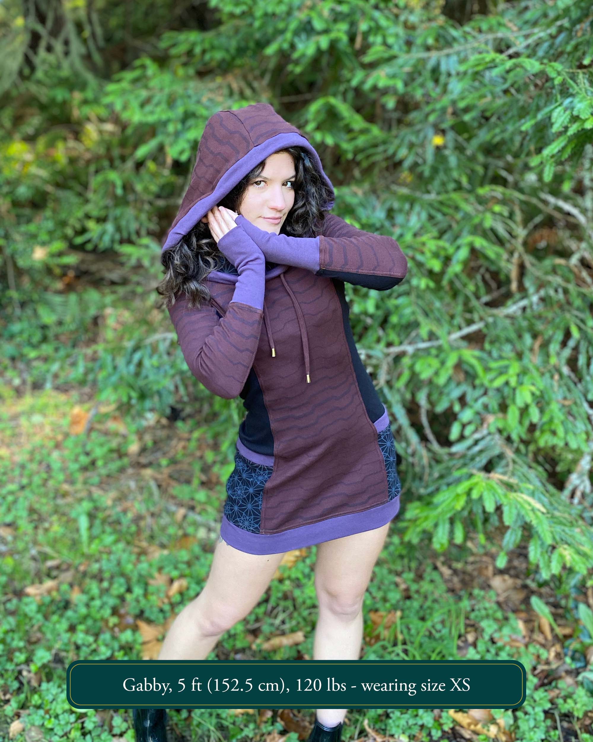 The Side Panel Portal Dress is a fitted tunic mini dress with a lined cowl hood and two side pockets. Sleeves are finished with thumbhole cuffs in soft baby rib fabric.