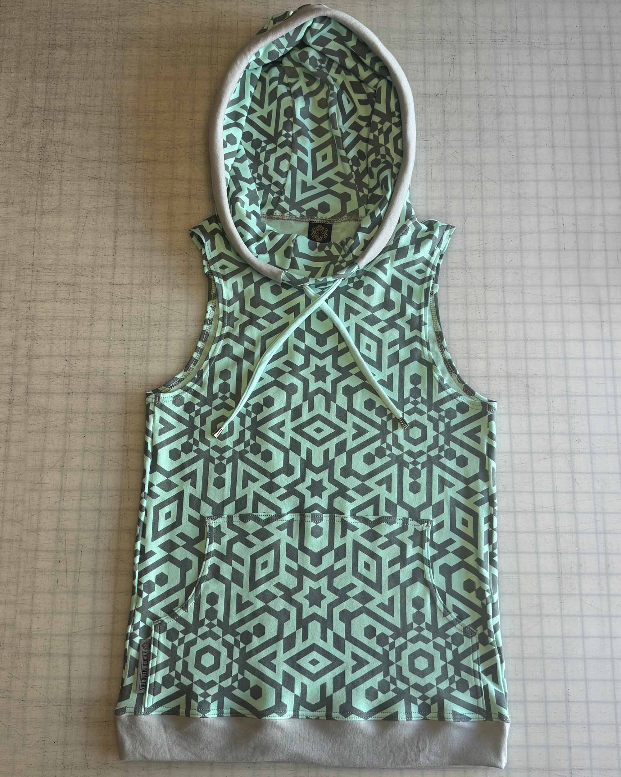 The Geo Modulator is your One of A Kind Garment Customizer. Edit and customize this long bodied cowl hood sleeveless pullover made in our 100% organic cotton interlock jersey knit fabric. Style with solid and geometric fabrics, screen prints, drawcords and extra add-ons. Build your dream Portal Tank today.