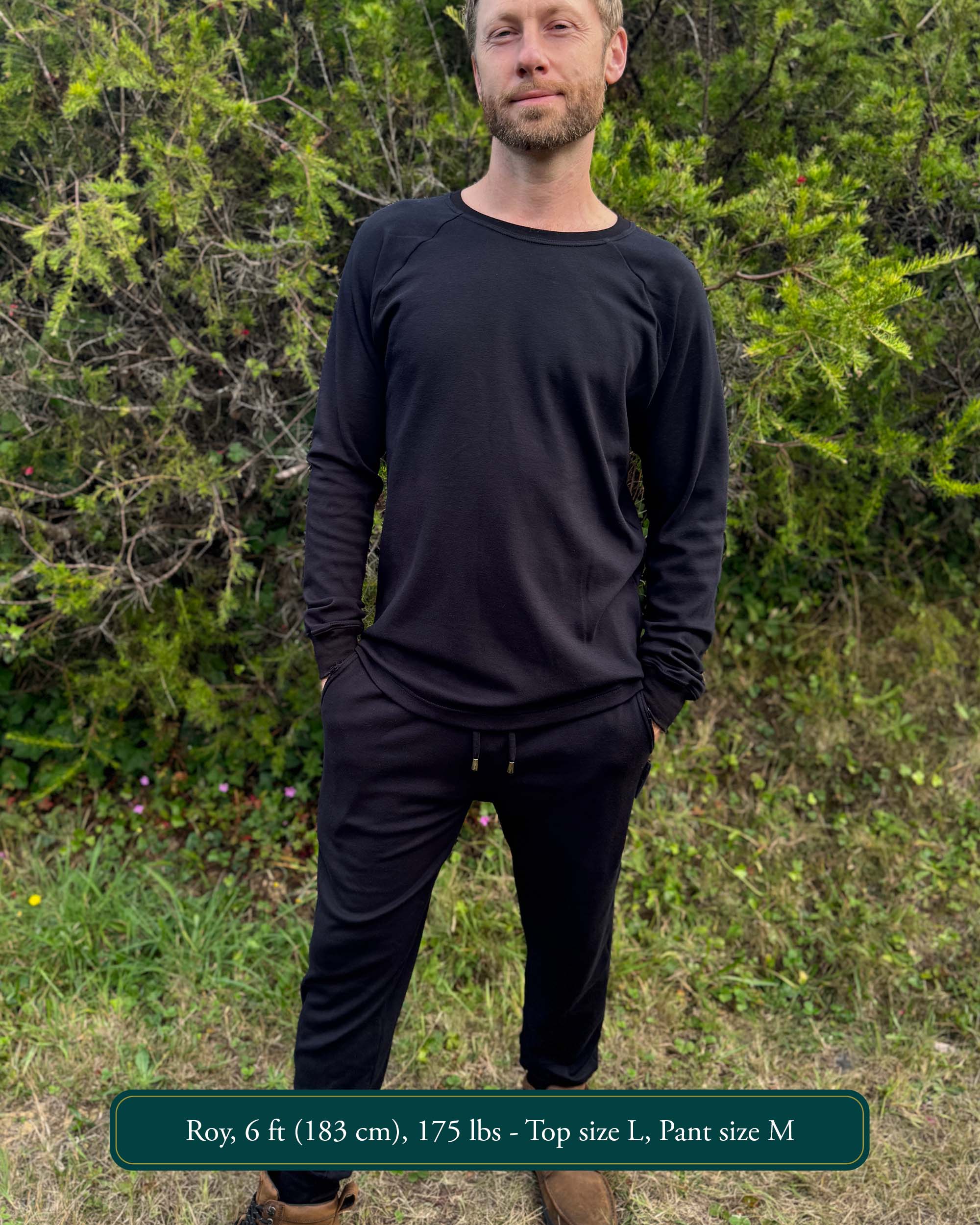 Men's matching joggers and long sleeve shirt, black with geometric printed accent fabric, worn by male model in nature.