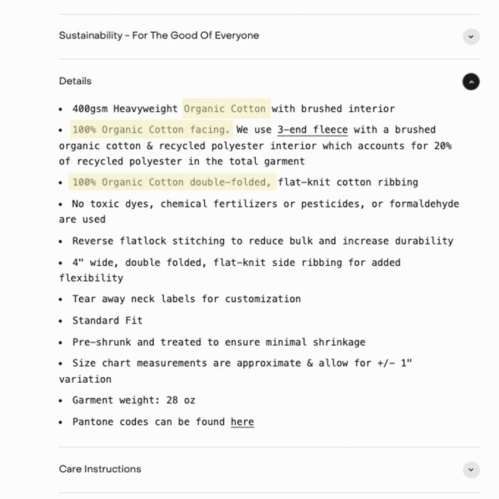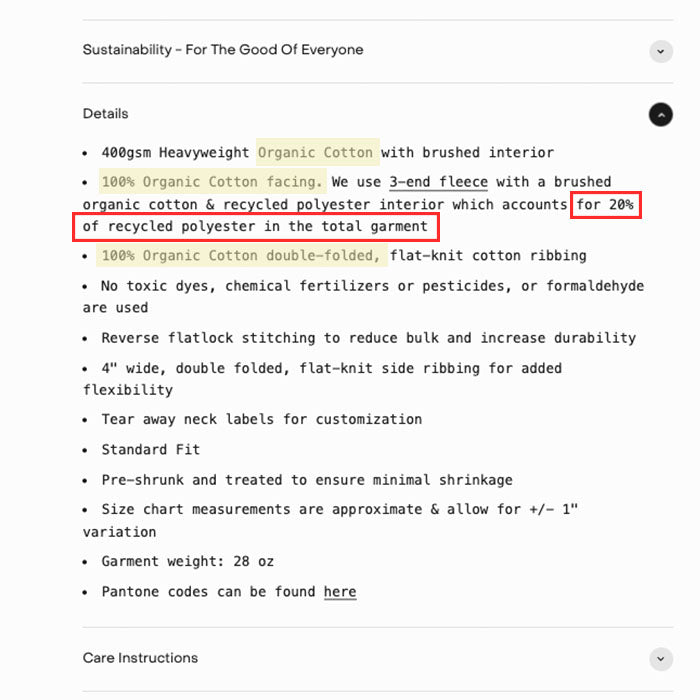 The content of these garments hide deep in collapsible tabs, while we are spammed with sustainable keywords.