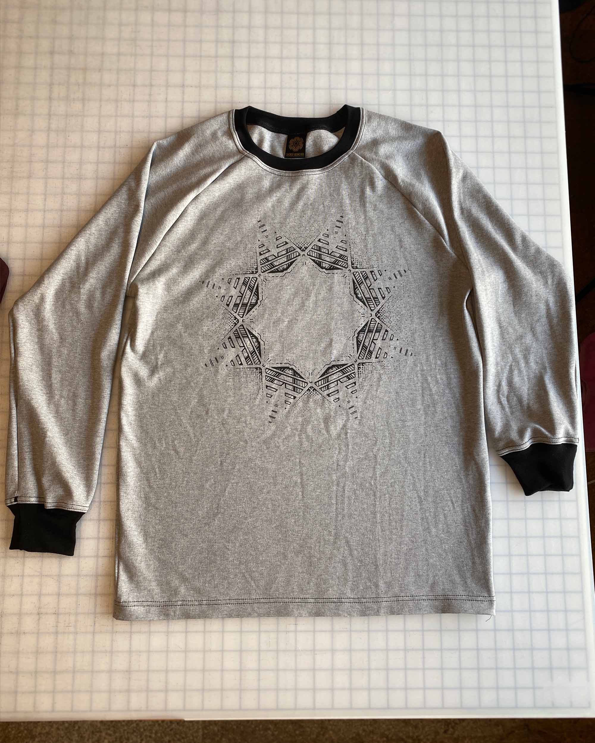 The Geo Modulator is your One of A Kind Garment Customizer. Edit and customize this long sleeve crew neck shirt made in our 100% organic cotton interlock jersey knit fabric. Style with solids and geometric fabrics, screen prints, and extra add-ons.