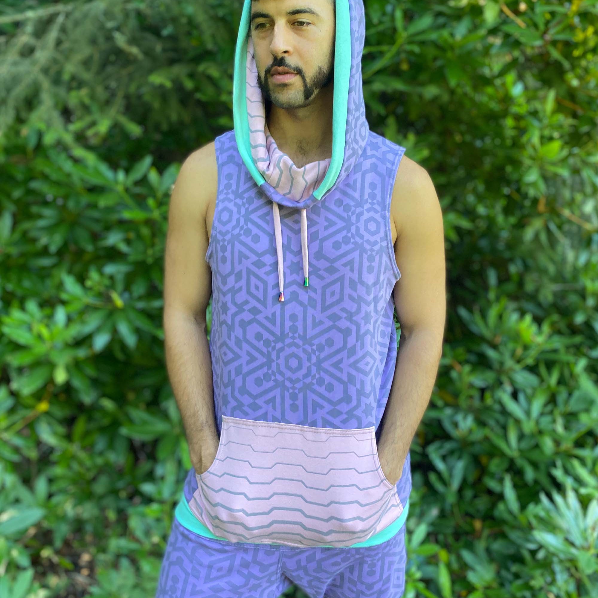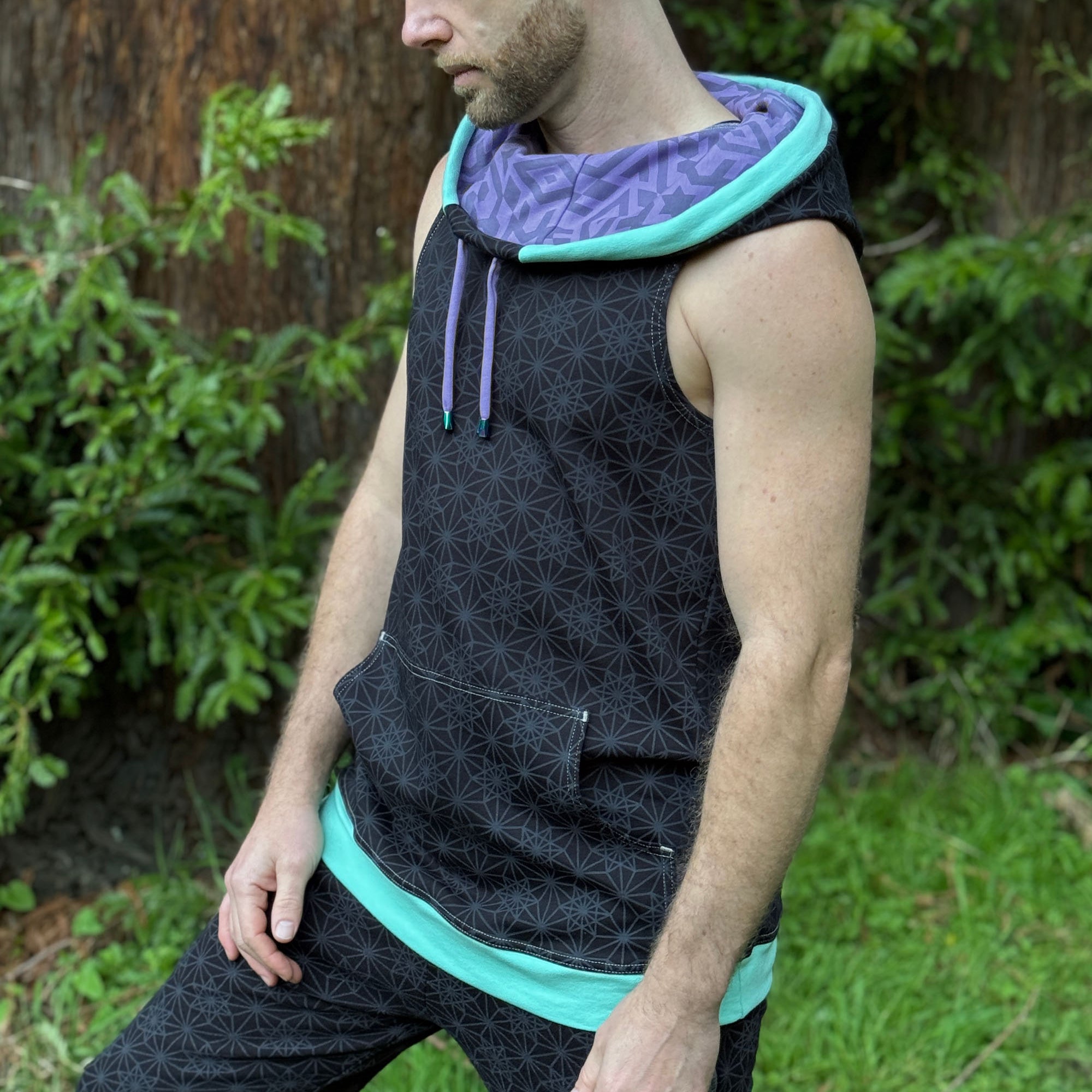 Made with 100% organic cotton, The Portal Tank is an extra long unisex sleeveless hoodie.  With water based sacred geometry printed fabrics, this cowl hooded tank top is our premium style for the festival late night dance scene.