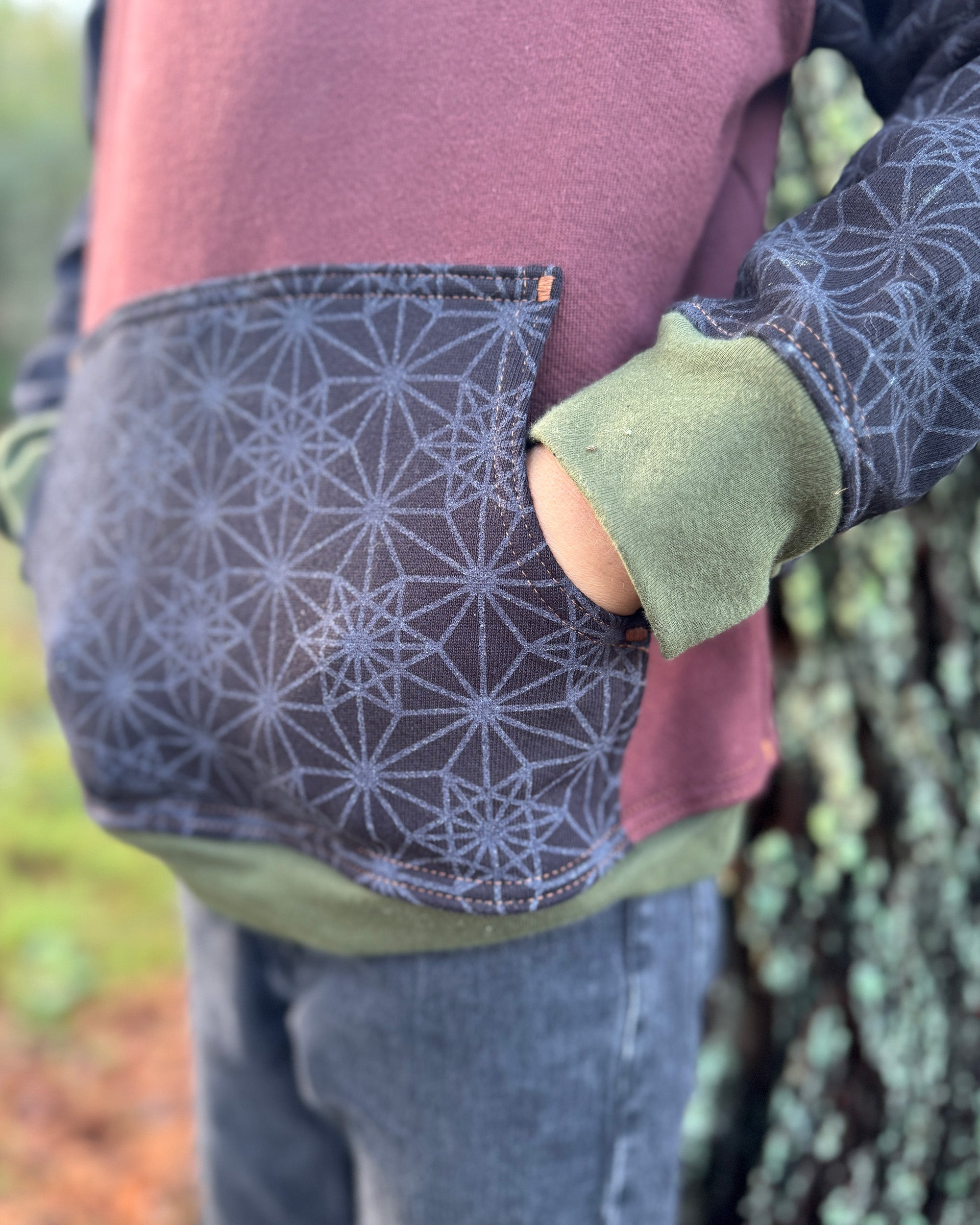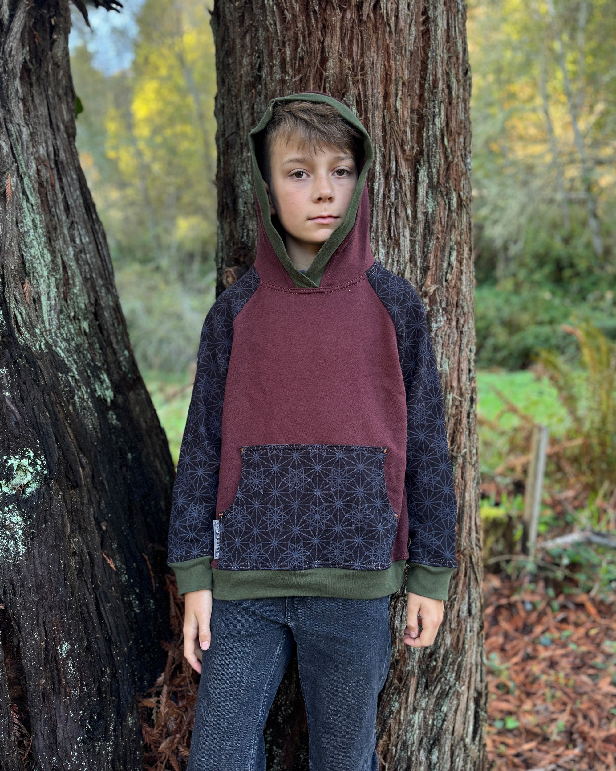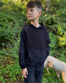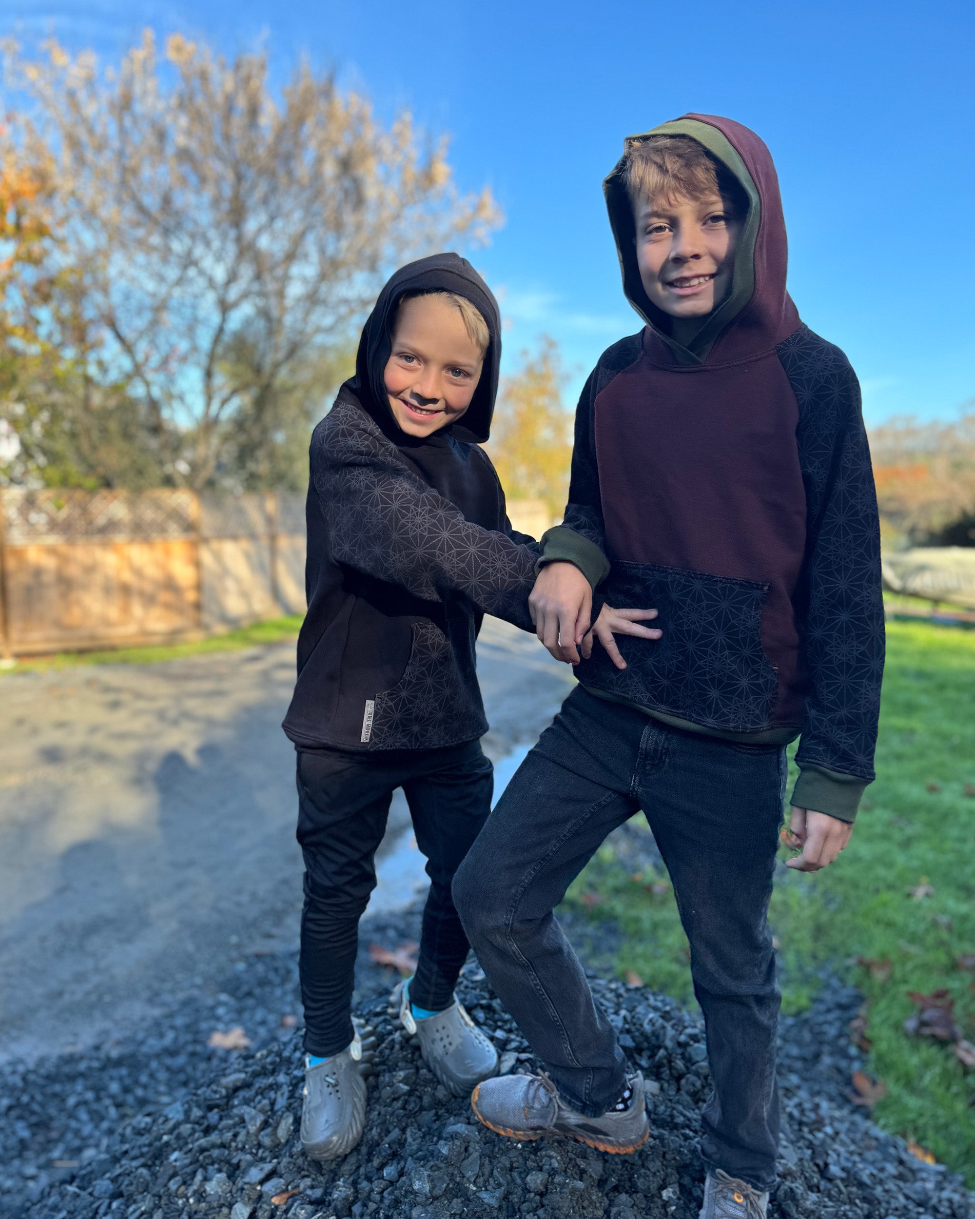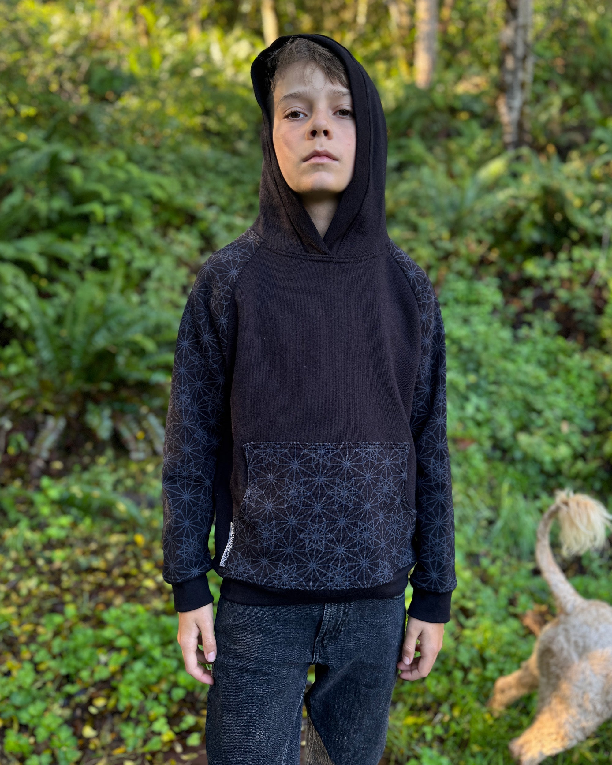 The Youth Habitat Hoodie is constructed in our heavyweight 100% organic cotton fleece fabric. This unisex kids style has a comfy fleece hood with water-based printed sacred geometry sleeves and kanga-pocket.