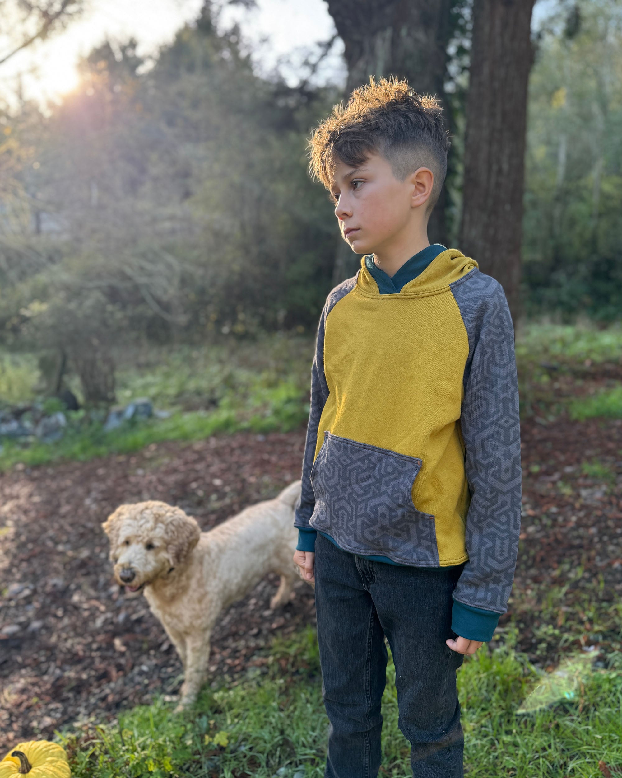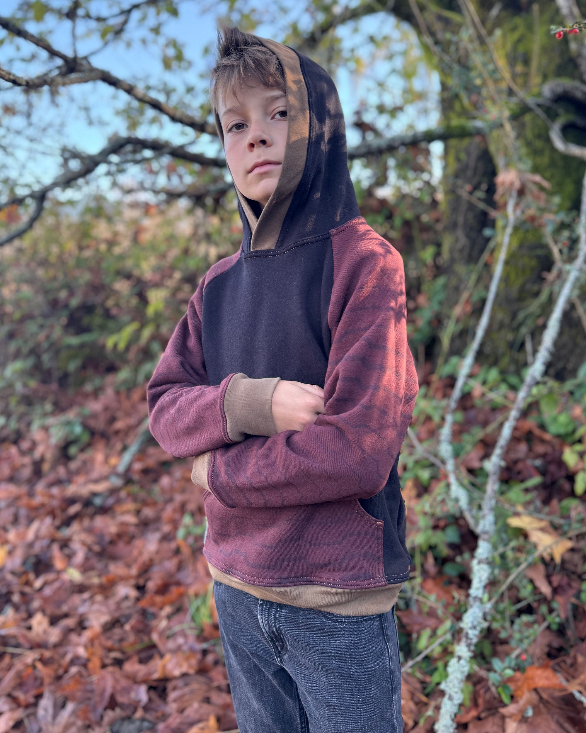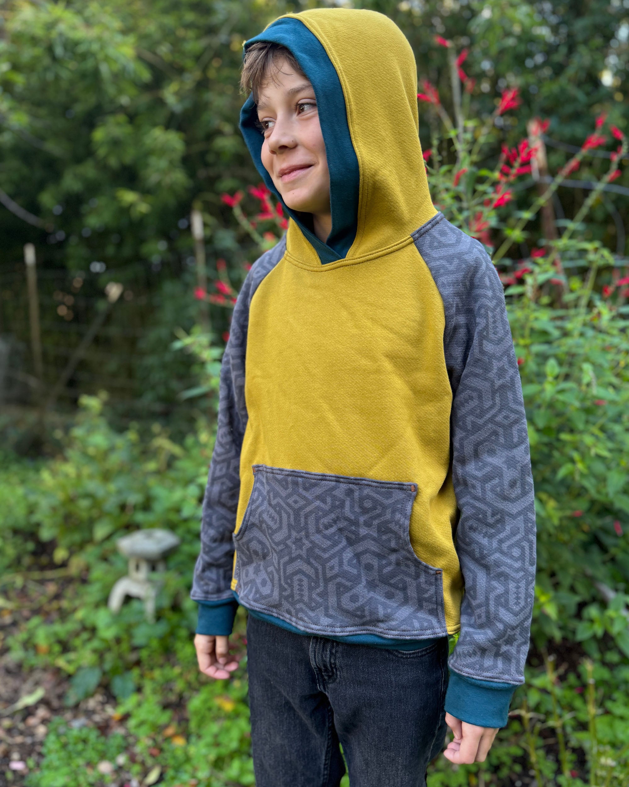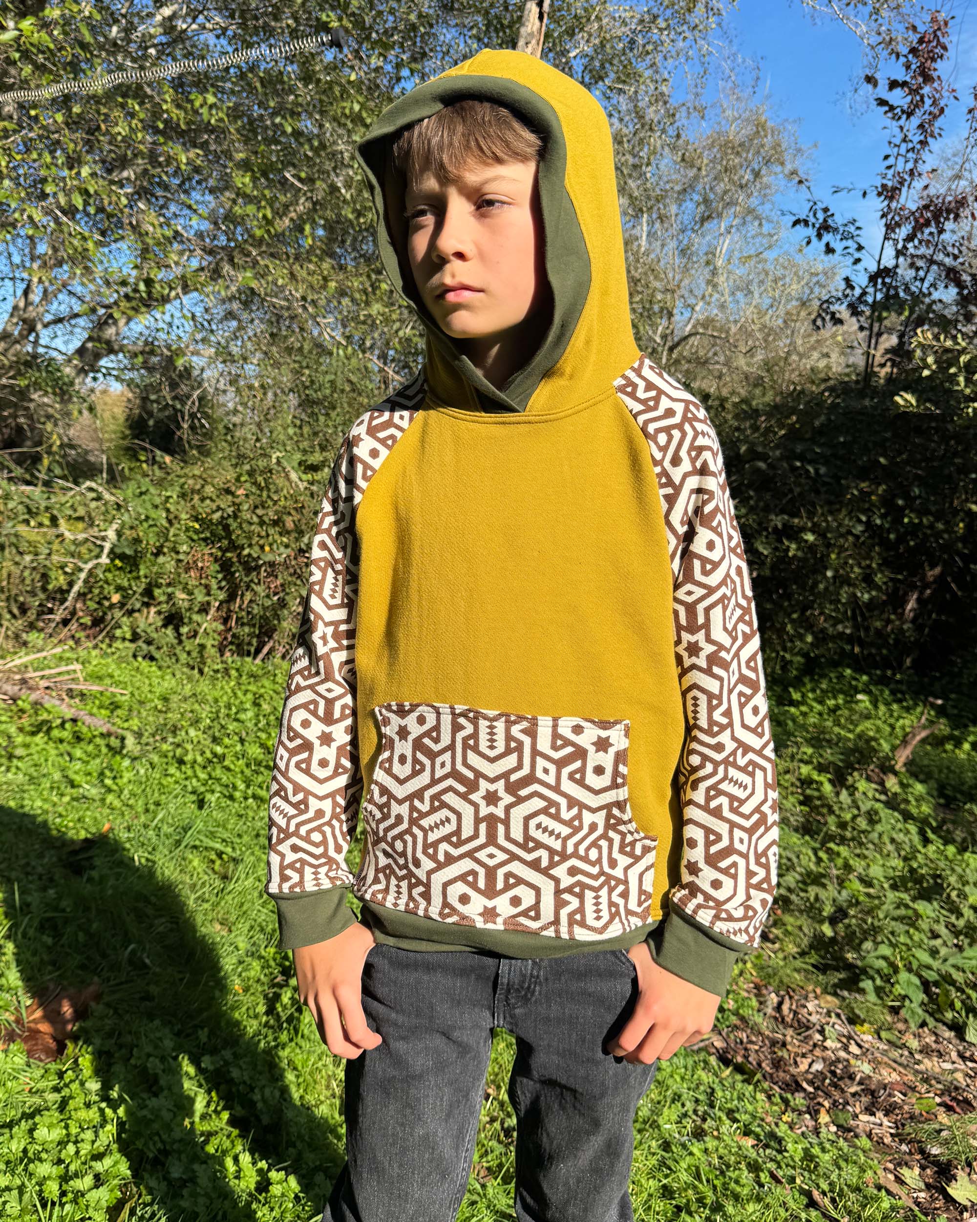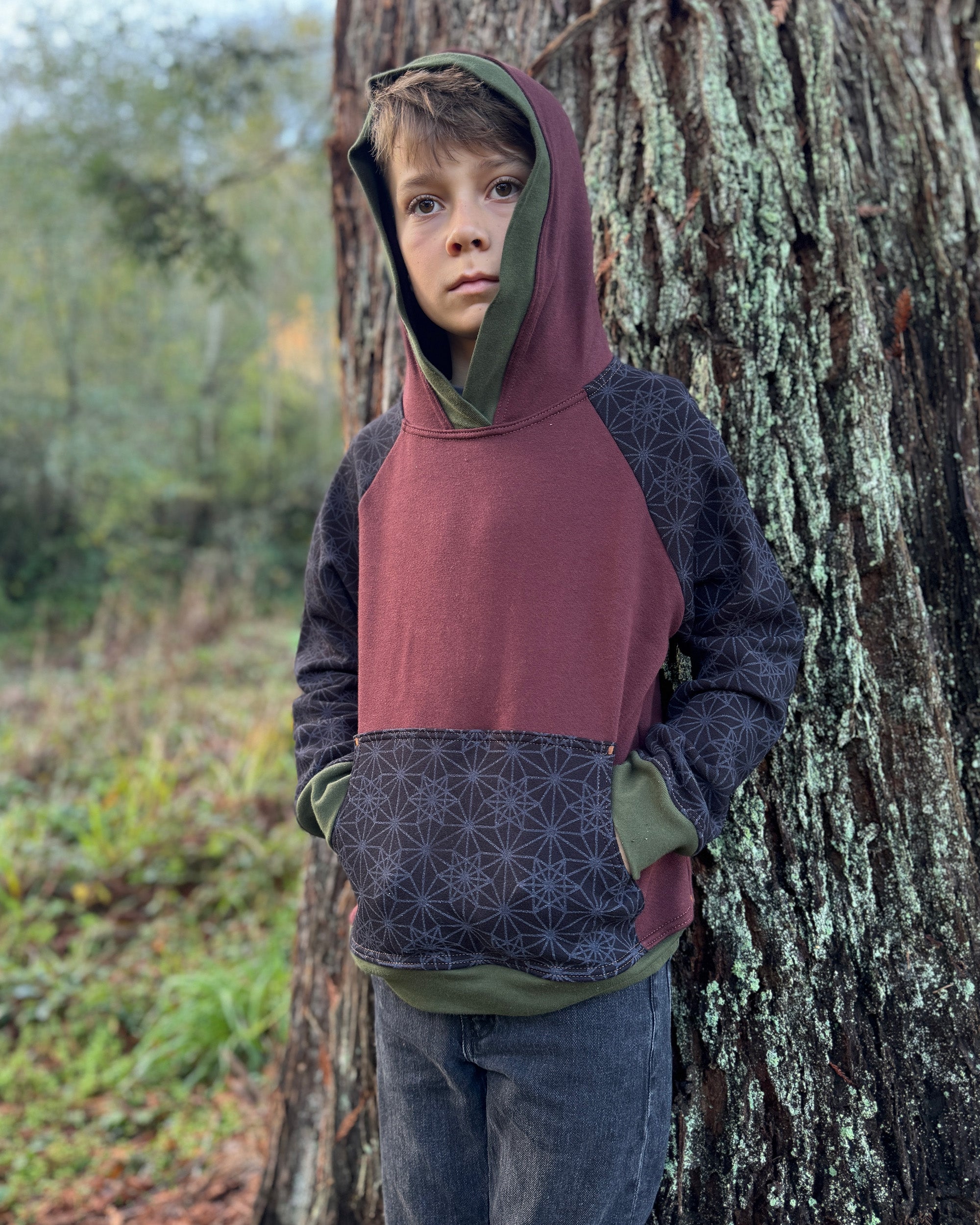 The Youth Habitat Hoodie is constructed in our heavyweight 100% organic cotton fleece fabric. This unisex kids style has a comfy fleece hood with water-based printed sacred geometry sleeves and kanga-pocket.